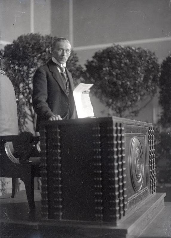 Asutava Kogu esimees August Rei kõnelemas Asutava Kogu avaistungil. Foto: A. Vannas