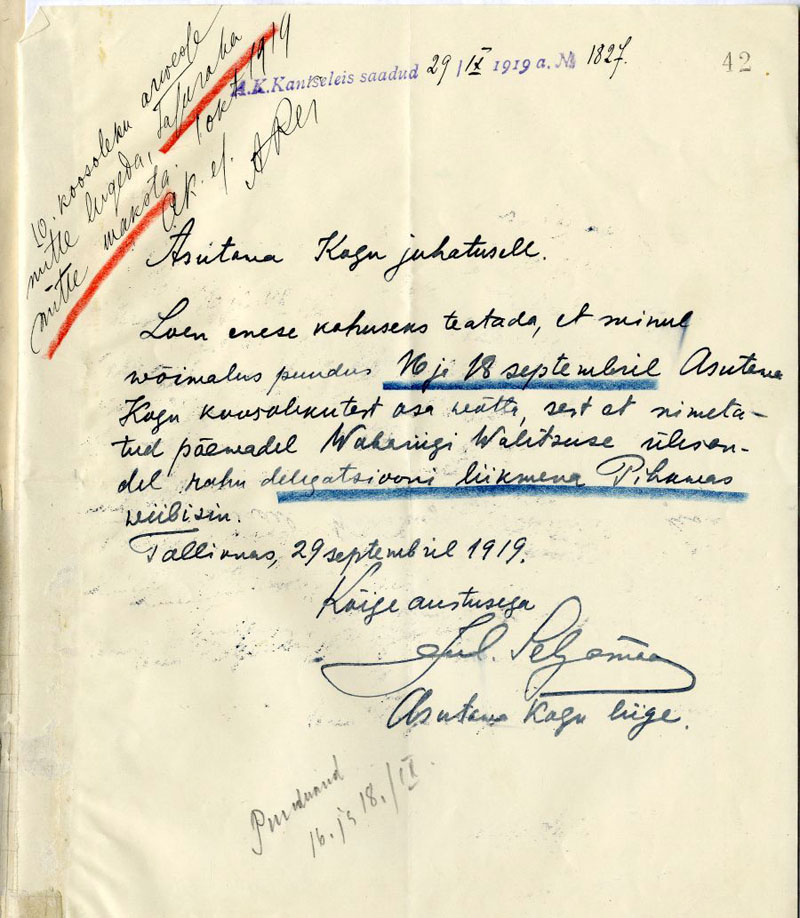 Astus tagasi 08.08.1919, teda asendas Anton Ratasepp