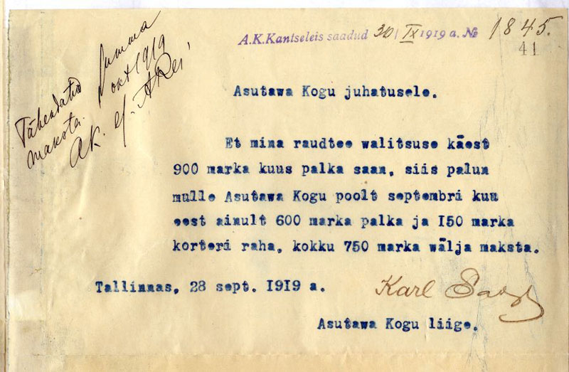 Alates 23.04.1919 (Jaan Letneri asemel)