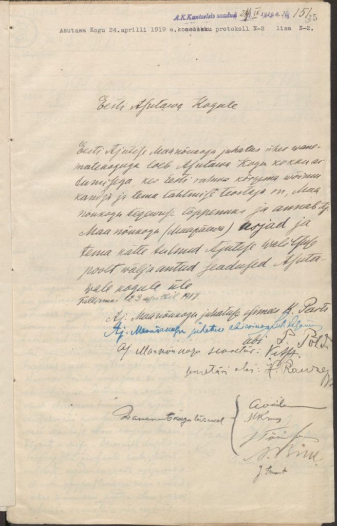 „Eilane päev andis 700-aastase kannatuse ja ootuse aja eest Eesti rahvale väärilise tasu. Väliselt võiks eilast päeva Asutavas Kogus võrrelda avamisepäevaga, hingeliselt tundus ta veel sügavam, jäädavam. Siis oli pidupäev, mis õhutas julgustavaid lootusi, kuna töö vili alles teadmatuses heljus. Eila nägime ja tundsime seda tööd hiilgaval, paremal tuleviku nurgakivi näol, nägime valminema rahva saatust ammu ihaldatud kujul. Eila astus Eesti rahvas iseseisvalt kultuurilisele arenemise teele, sellele edenemise teele, mis ajaloos riikisid loonud ja koos hoidnud.“
