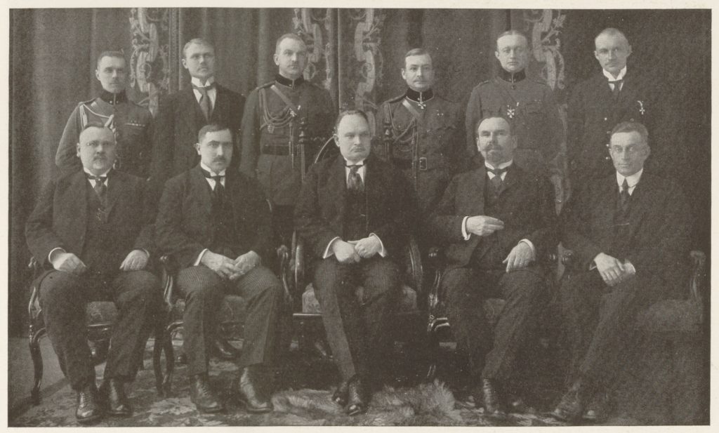 Visiidil osalejad. Istuvad vasakult: põllutööministri abi Jaan Raamot, Välisminister Ants Piip, riigivanem Konstantin Päts, kaubandus-tööstusminister Karl Ipsberg, põllutööminister Bernhard Rostfeldt. Seisavad: riigivanema adjutant leitnant August Schönberg, välisminiteeriumi informatsiooni büroo juhataja Eduard Laaman, sõjavägede staabi ülem kindral Paul-Adolf Lill, sõjaministri abi kindral Andres Larka, ratsaväe inspektor Arthur von Buxhoeveden ja mereväe staabi ülem kapten Hermann Salza