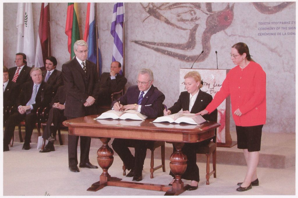 President Arnold Rüütel ja välisminister Kristiina Ojuland kirjutasid alla ühinemislepingule Euroopa Liiduga. Foto: E. Peinar