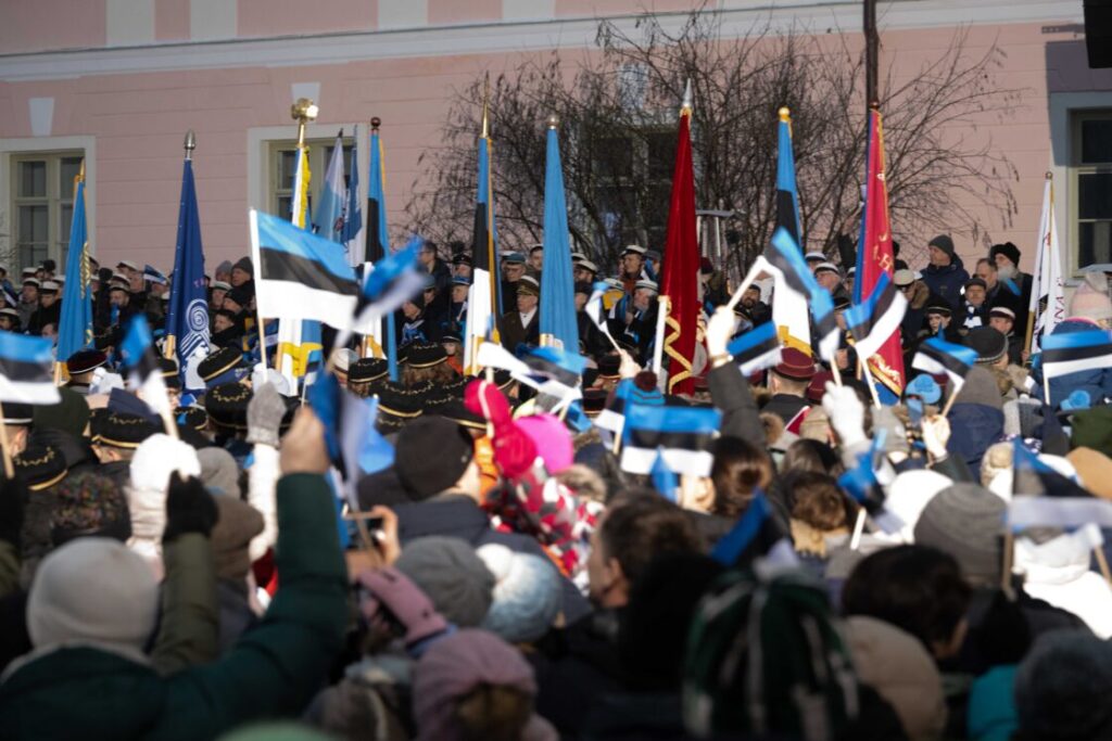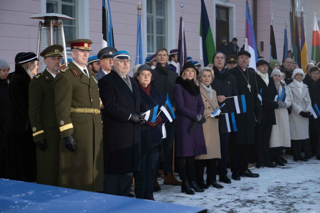 Pidulik lipu heiskamine Pika Hermanni torni, 24. veebruar. Eestis viibisid visiidil NATO peasekretär Jens Stoltenberg ja Euroopa Komisjoni president Ursula von der Leyen. Foto: E. Peinar